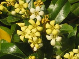 トベラ (扉) 別名:トビラノキ(扉の木) 英名: Japanese Cheesewood 学名: Pittosporum tobira トベラ科 トベラ属 |
